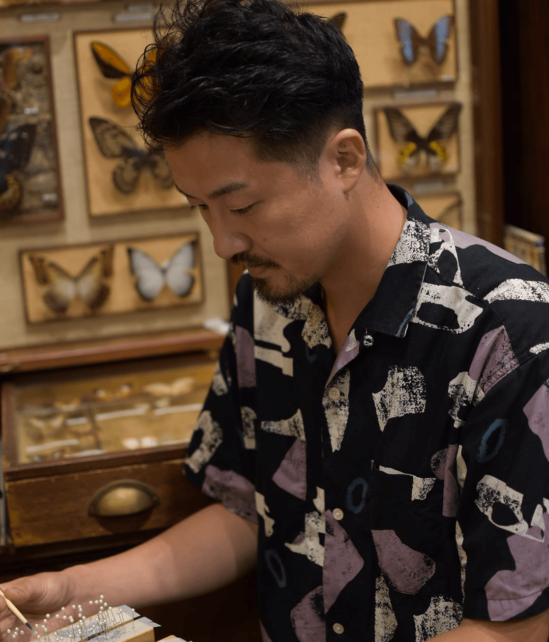 1991年 大阪府生まれ。昆虫好きの父の影響で幼少期より昆虫採集に親しみ、とりわけ蝶の美しさに魅了される。 小学生の頃、親に連れられて訪れた「六甲昆虫館」で、世界中の美しい昆虫たちと、その昆虫の美しさを際立たせる標本箱に出会い衝撃を受ける。 この出会いからすでに、昆虫館の館長になることを夢見ていた。中高・大学でもその思いは変わらず、大学では「京都大学蝶類研究会」に所属。 大学卒業後も、「昆虫を美しく魅せたい」・「昆虫標本のお店を持ちたい」という思いが消えることはなく、一般企業に勤めながら、名古屋の「宮本家具工房」で 標本箱の制作するための木工技術を学んだ。約4年間勤務した頃、幼少期より通っていた六甲昆虫館の閉店を知り、私が昆虫を好きになった大きなきっかけ、 憧れのお店を潰したくないという思いから、先代の長山に六甲昆虫館の存続・代の継承を申し出る。快くご了承頂き、現在六甲昆虫館の2代目館長として現在に至る。